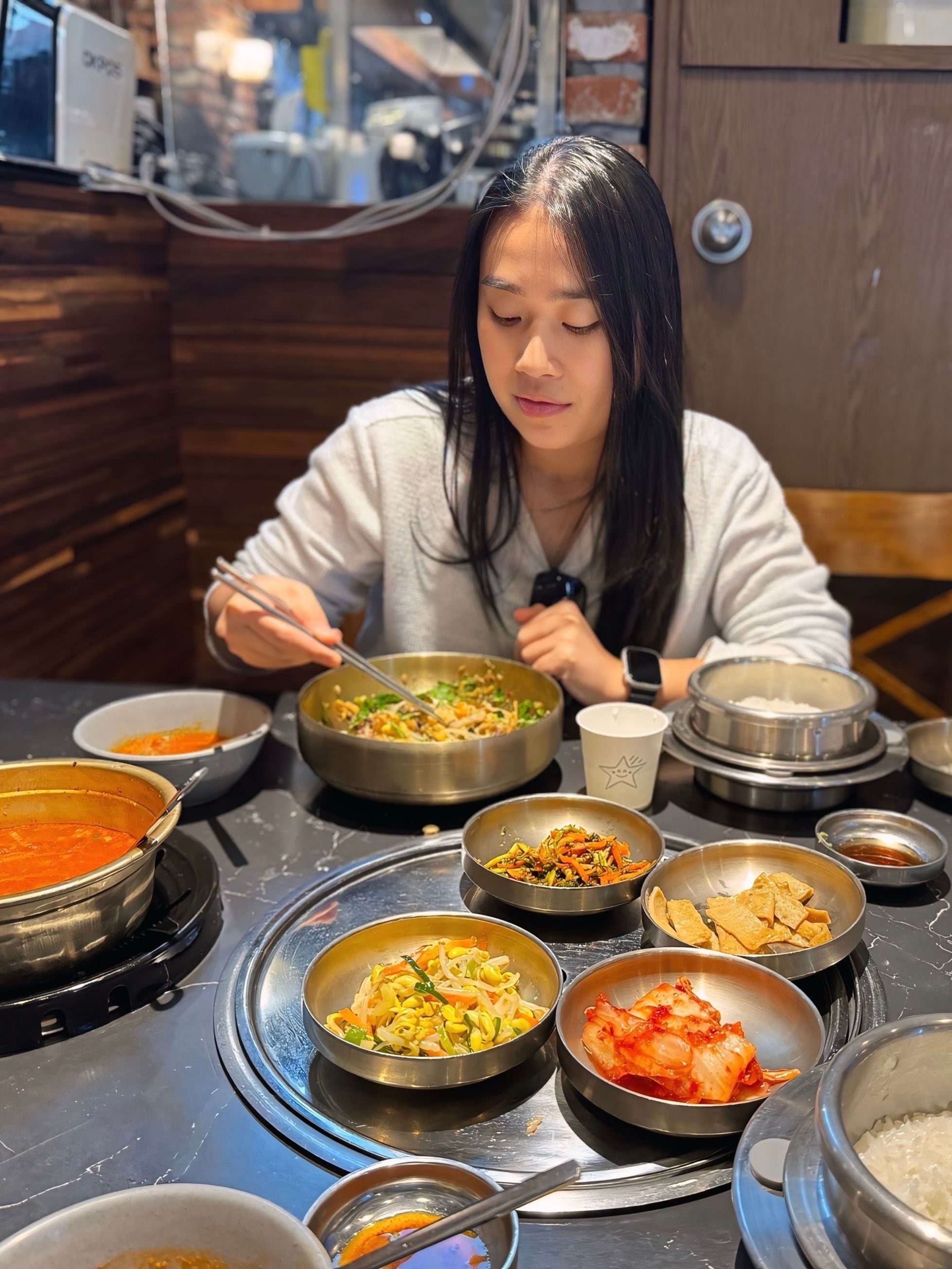 Here's me eating at a restaurant in Seoul last year. Also pregnant. Also not eating perfectly. Also completely fine with it. 📸